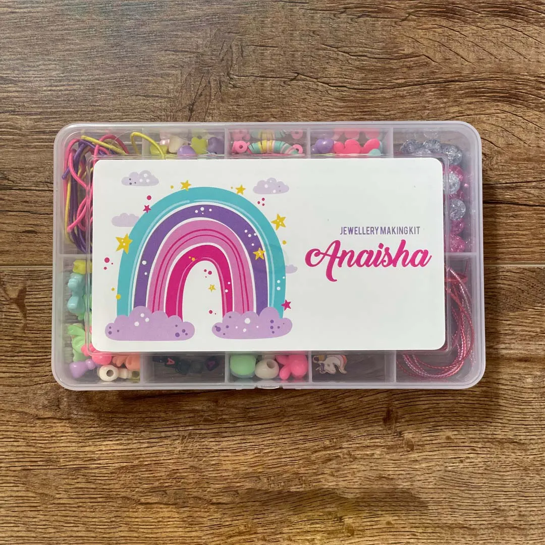 The Personalised jewellery Kit is a stunning DIY set for kids. It includes beads, strings, a metal nameplate with the child’s name, and various charms. Kids can create their own unique & personalised necklaces or name initial bracelets with this fun and creative kit.